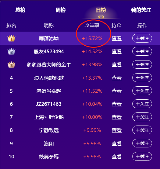 今天模拟大赛日榜榜单前十的参赛股友,多数都持有稀土永磁相关概念股。其中日榜榜首股友“雨落池塘”,在周一满仓模拟买入龙磁科技,今日收益率高达15.72%,他买入时机把握的很好,值得我们学习。