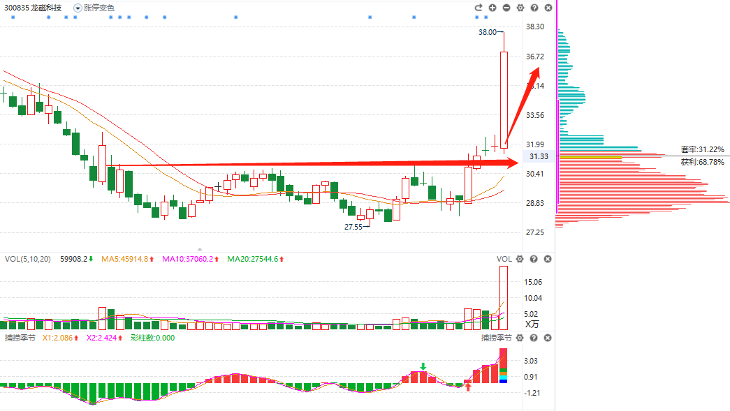 龙磁科技此前两个月在低位持续震荡,形成底部筹码单峰密集,在上周四放量突破平台压力位,上周五小幅震荡上涨,确立上涨趋势,周一十字星调整,站稳平台。股友“雨落池塘”正是在周一以32.18的价格,全仓模拟买入。今天该股强势拉升,盘中最高涨幅达19.08%。这是典型的低位平台突破买入。个股在低位经历了长期的震荡盘整之后,一旦股价突破平台压力位,后续则大概率会打开上涨空间。在实盘操作中,对于低位横盘整理的股票,经常因为没有盯盘,从而导致错过突破买入点。面对这种情况,可以考虑使用智能交易的上穿买入条件单,一旦股价突破预设的压力位,系统就会自动委托买入,即使没有盯盘,也能帮助我们买在起涨点。没有使用过的股友,可以看视频学习。
