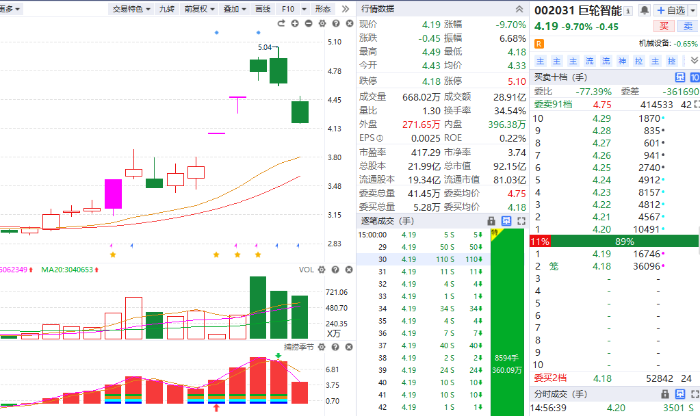 巨轮智能在上周四、周五连续涨停, 部分参赛股友模拟持有该股,收益率超过20%。在周一的总结中曾提示注意止盈,近两个交易日股价连续大幅回落。多数股友在周一已经成功逃顶,但通过模拟大赛的实盘交易跑马灯可以发现,少数参数选手在今天才清仓离场,而收益也大幅蒸发。